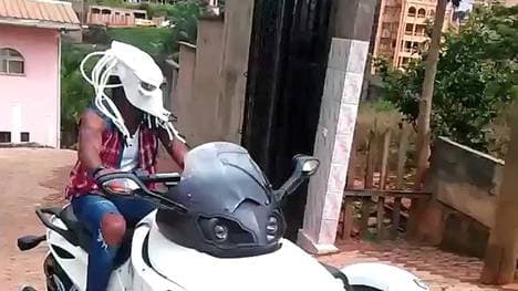 In seinem Urlaub in der Heimat kracht er los auf einem Trike, also einem Motorrad mit drei Rädern. Statt eines Helms trägt er eine weiße Maske, die genauso aussieht wie das Monster aus dem Film "Predator".
