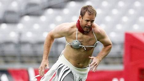 Vor der Heimpartie gegen die Green Bay Packers musste der Quarterback beim Aufwärmen halbnackt - bekleidet war er nur mit einer kurzen Leggings, einem Fransenrock und einem seltsam anmutenden BH - über das Feld des Stadions der Universität von Phoenix laufen.