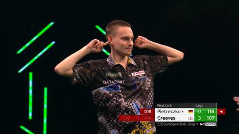 Ricardo Pietreczko hat am Sonntagachmittag auch sein zweites Match beim Grand Slam of Darts in Wolverhampton (täglich LIVE im TV auf SPORT1 und im LIVESTREAM) verloren und hat damit keine Chance mehr auf das Erreichen der K.o.-Runde. Der 29-Jährige musste sich dem Darts-Wunderkind Beau Greaves mit 1:5 geschlagen geben.
