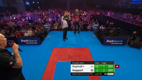 Im Verlauf des letzten Satzes zeigte er sich sichtlich verärgert über Aspinalls Verhalten, der sich zunächst mit dem Publikum anlegte und dann auch noch das Gespräch mit seinem Gegner suchte. (DATEN: Spielplan und Ergebnisse des Darts World Grand Prix)