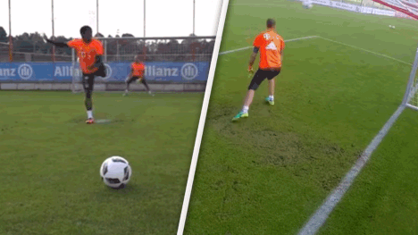 Mega-Trickshot von Douglas Costa: Im Training des FC Bayern nagelt der Brasilianer einen No-Look-Elfmeter mit der Hacke unhaltbar in den Winkel.