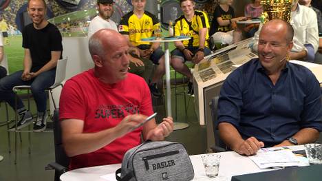 Moderator Thomas Helmer und Co-Moderatorin Jana Wosnitza begrüßen als Gäste den ehemaligen BVB- und Nationaltorhüter Roman Weidenfeller sowie die Experten Mario Basler und Peter Neururer.