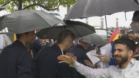 Die nonchalante Stimmung sollte sich auch am Freitag trotz des strömenden Regens ein paar Hundert Kilometer weiter südwestlich nicht ändern. Gegen 17.15 Uhr fuhr der Mannschaftsbus in Herzogenaurach vor – und einige Tausend Fans nahmen die Spieler in Empfang. Fannähe macht sich also bezahlt, fand auch der Bundestrainer auf der Bühne: „Vielen Dank fürs Erscheinen. Das Wetter ist beschissen. Das liegt aber nicht am mir. Ich habe immer aufgegessen.“