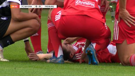Nach einem Zusammenstoß bleibt die ehemalige DFB-Stürmerin sich windend am Boden liegen. Im Luftduell war sie mit ihrem Kopf mit Ballisager zusammengestoßen. Es geht aber wohl wieter für die Kapitänin.