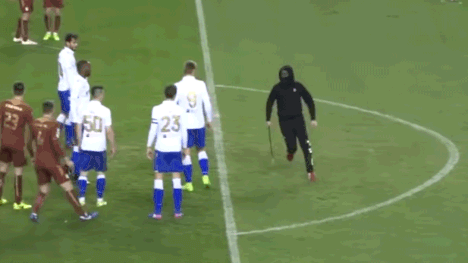 Mit einer Eisenstange bewaffnet lief der Vermummte in der Nachspielzeit auf das Spielfeld und jagte den Schiedsrichter durch den Strafraum. Dieser flüchtete sich hinter die Spielertraube, die Akteure versuchten vorsichtig, den gewaltbereiten Hooligan zu beruhigen.