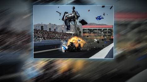 Auf Höhe der Ziellinie explodierte der Motor des sogenannten "Funny Cars" vom 16-maligen Champion John Force. Ein lauter Knall, Feuer brach aus, das Chassis flog durch die Luft - doch der 68-jährige Force blieb wie durch ein Wunder unverletzt.