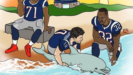Garoppolo trägt einen Delfin zurück ins Meer, Fleming winkt zum Abschied, McCourty kullert sogar eine Träne das Gesicht herunter. Über dem Bild steht im Zeitungsstil die Überschrift "Dolphins nach Hause geschickt", eine Anspielung auf die Niederlage der Mannschaft aus Miami.